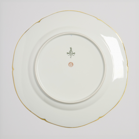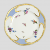 Assiette plate. Forme créée en 1756 associé à un décor de 1765. Les bouquets, peints à main levée en peinture de petit feu, sont tous différents. Le marli est rehaussé de peignés en or sur un fond bleu agate. Marques de Sèvres sous le talon.