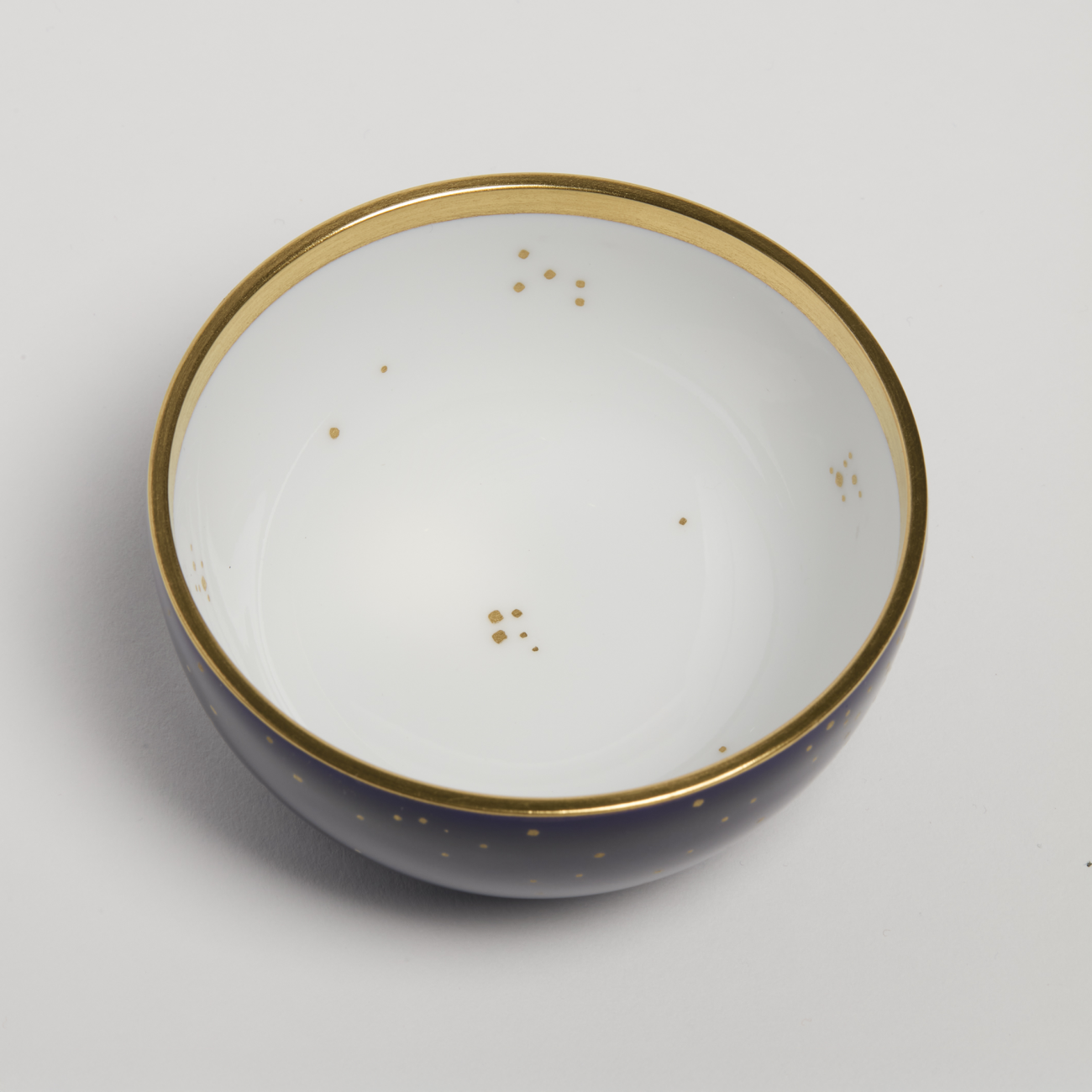 Boîte de Mantes de deuxième grandeur en porcelaine tournée, associée à un décor à motif Galaxie en or 24 carats sur fond bleu de Sèvres imaginé en 2017 par le designer graphique Philippe Apeloig pour la Manufacture. Filet d'or au pied et au contact du couvercle. Signature du designer et marques de Sèvres sous le talon.