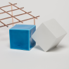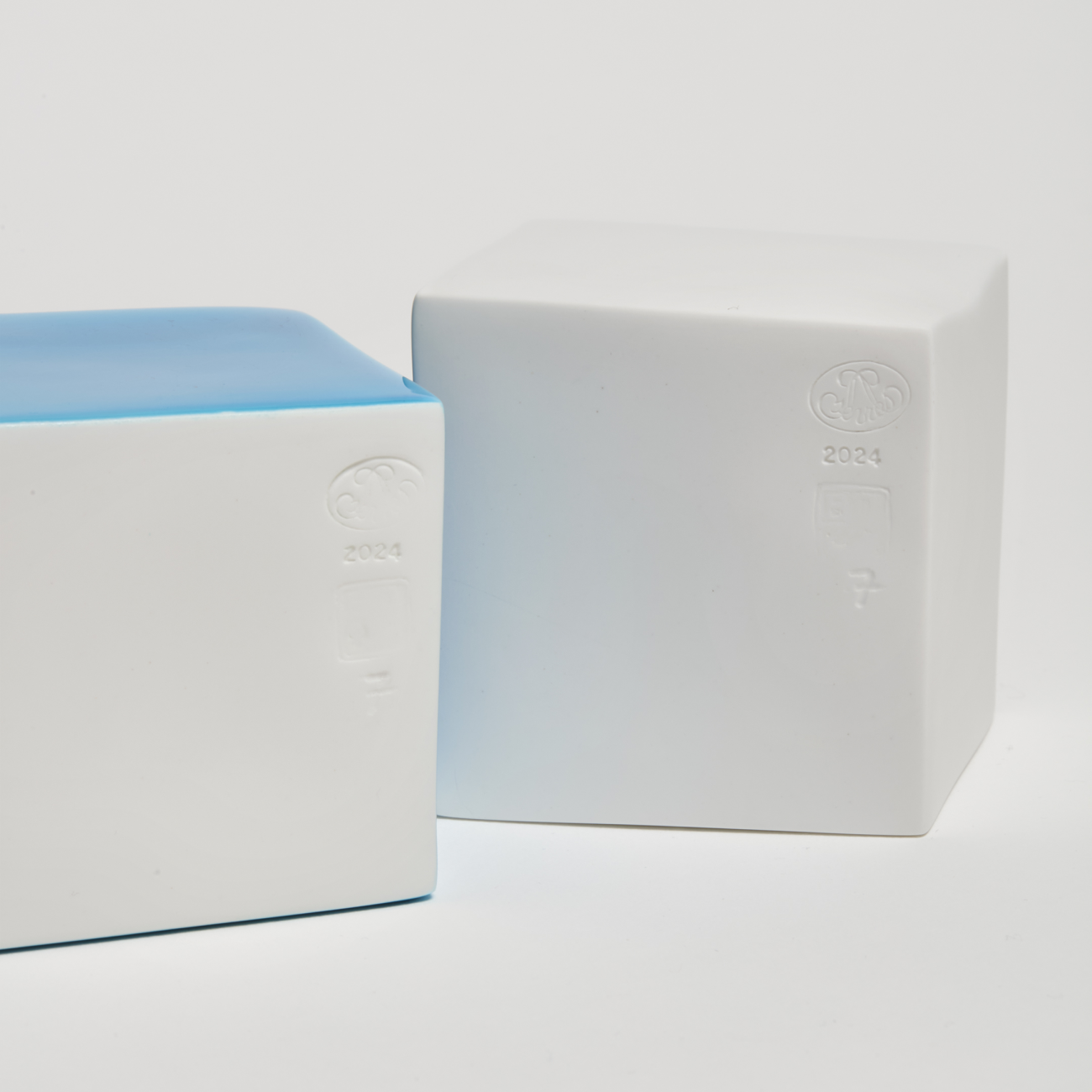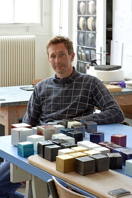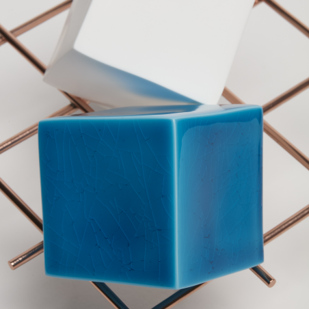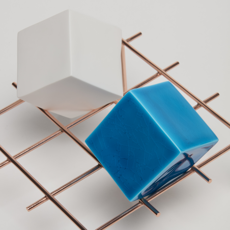L’artiste céramiste Emmanuel Boos a bénéficié d’une résidence au laboratoire de la Manufacture en 2016-2018. C’est là que depuis 1740 sont conçus, produits et archivés les émaux de couleur de Sèvres. Sa pratique de l’émail se développe en volume et en sculpture. Le choix du cube comme élément générique pour développer ses palettes de couleurs lui permet d’observer le comportement de l’émail à la verticale, à l’horizontale, sur des arêtes mais aussi en épaisseur.