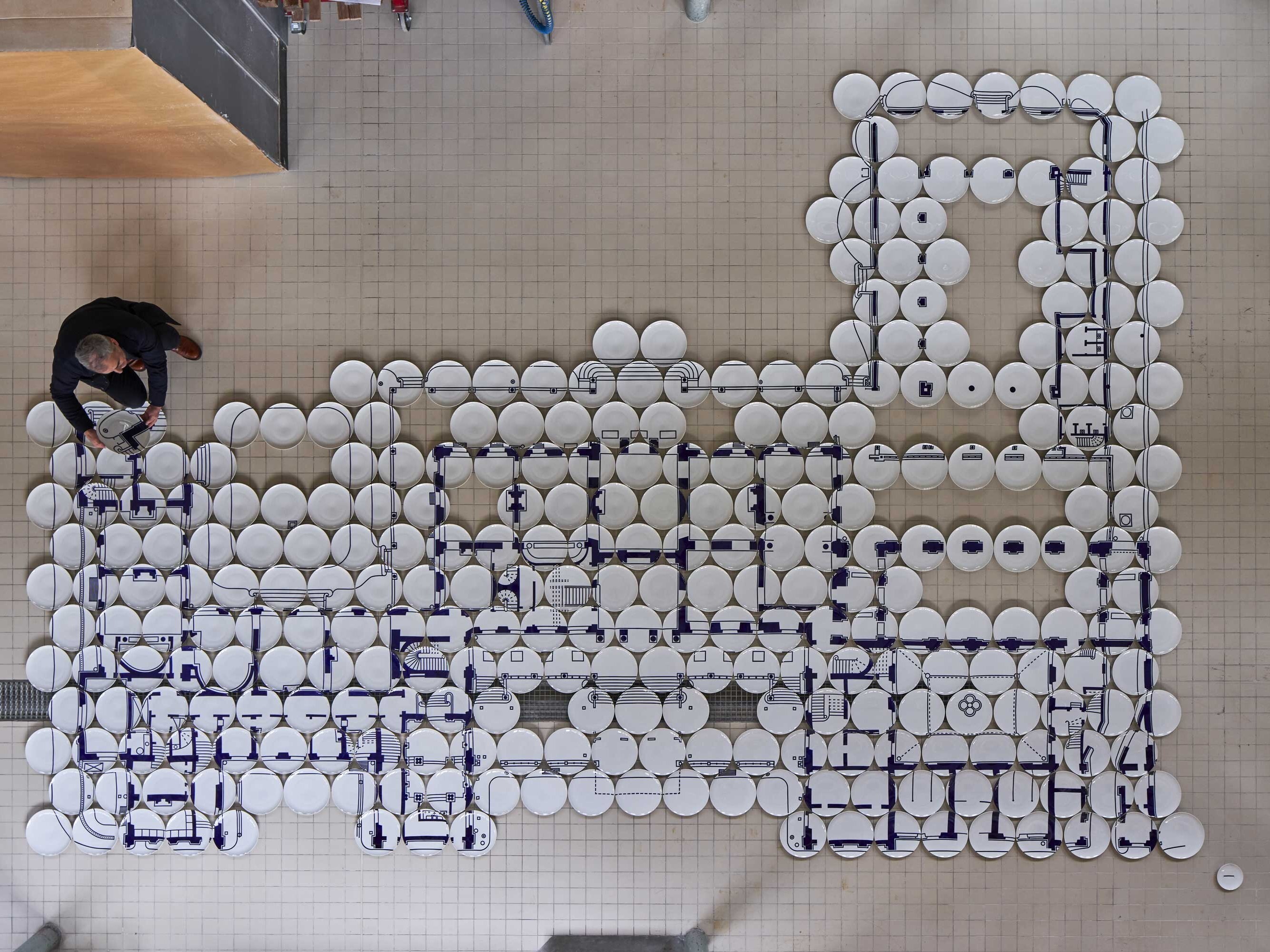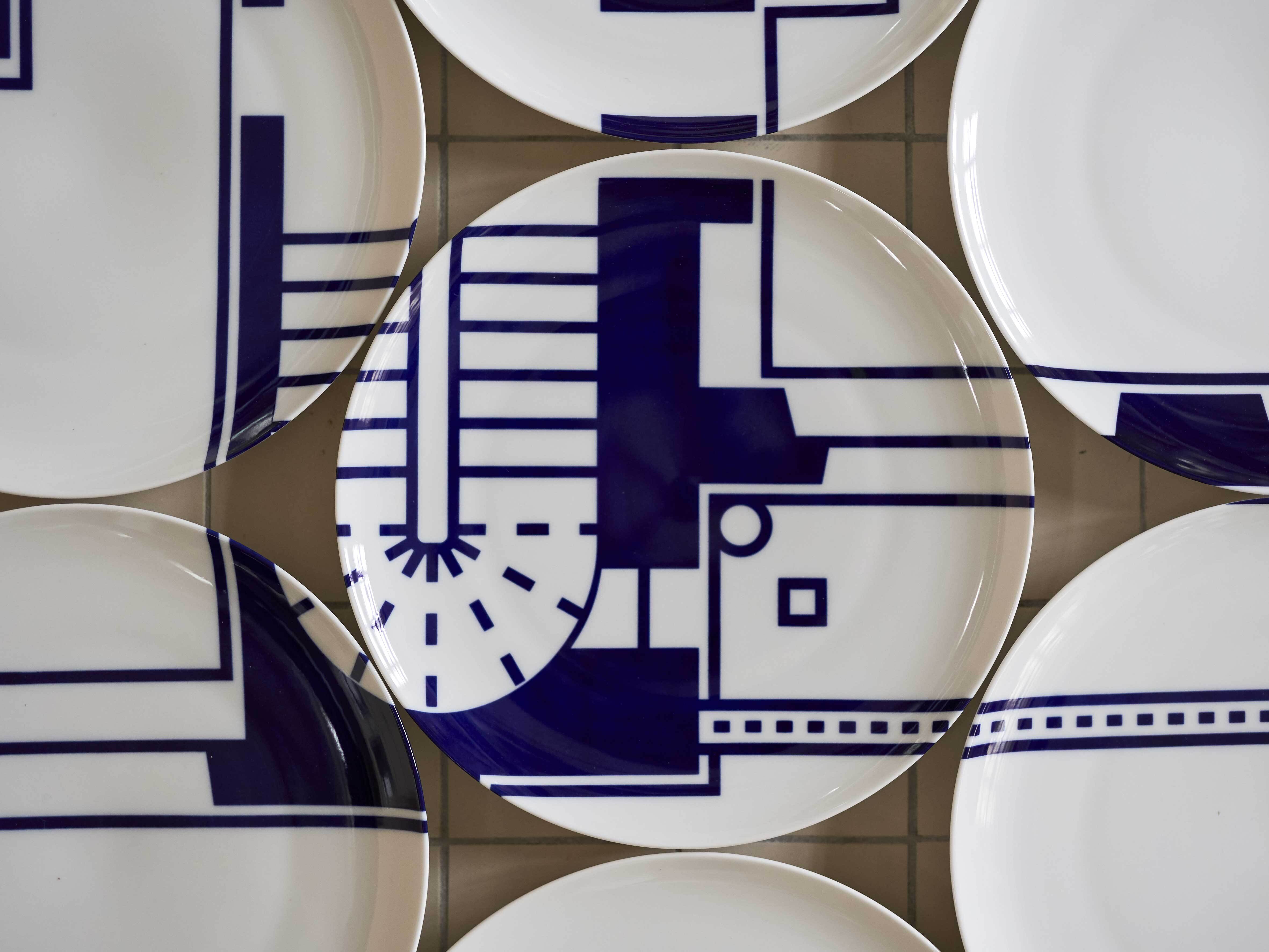 Pour l'artiste Ce service révèle le dessin en plan des bâtiments de l’Élysée. L’utilisation du bleu de Sèvres permet de redessiner les traits du bâti de l’Élysée à la manière des « bleus » d’architectes.