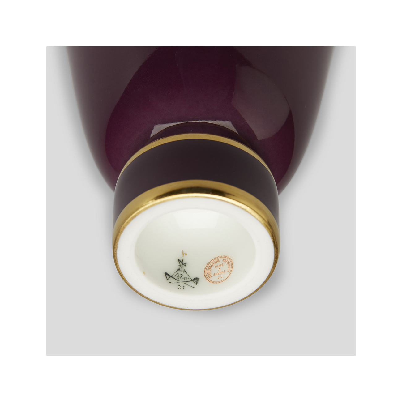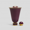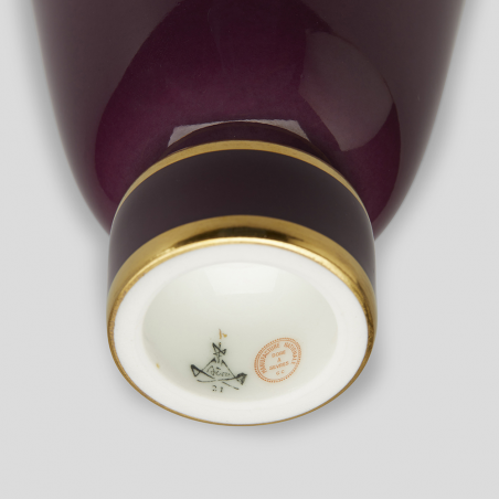 Défiant la gravité, la silhouette singulière du vase Rulhmann n°4 évoque l’essence même du style Art déco. Petit vase fermé à bouchon. Décor aubergine et filets d'or 24 carats. Marques de Sèvres dans le pied.