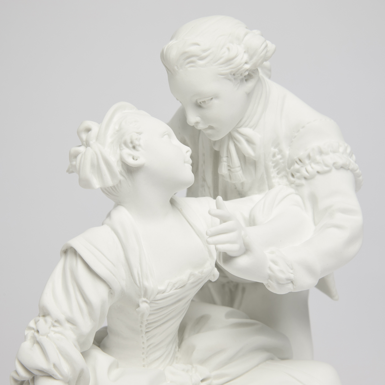 The scene depicted in this biscuit is taken from the play of the same name, commissioned from Favart by Madame de Mauconseil. It was first performed at Bagatelle before the Polish king Stanislas. The play was such a success that it was later performed four times at Versailles and once at Trianon. The biscuit portrays a reunion between a gardener, Jacquot, and his beloved, Colette.