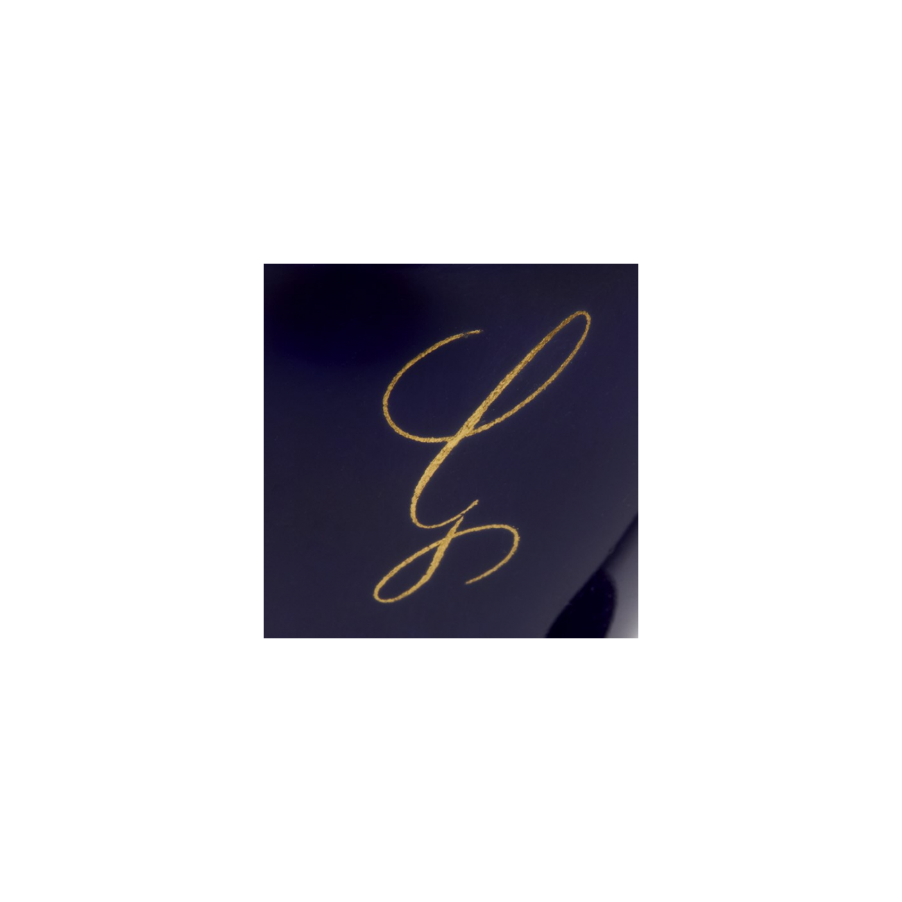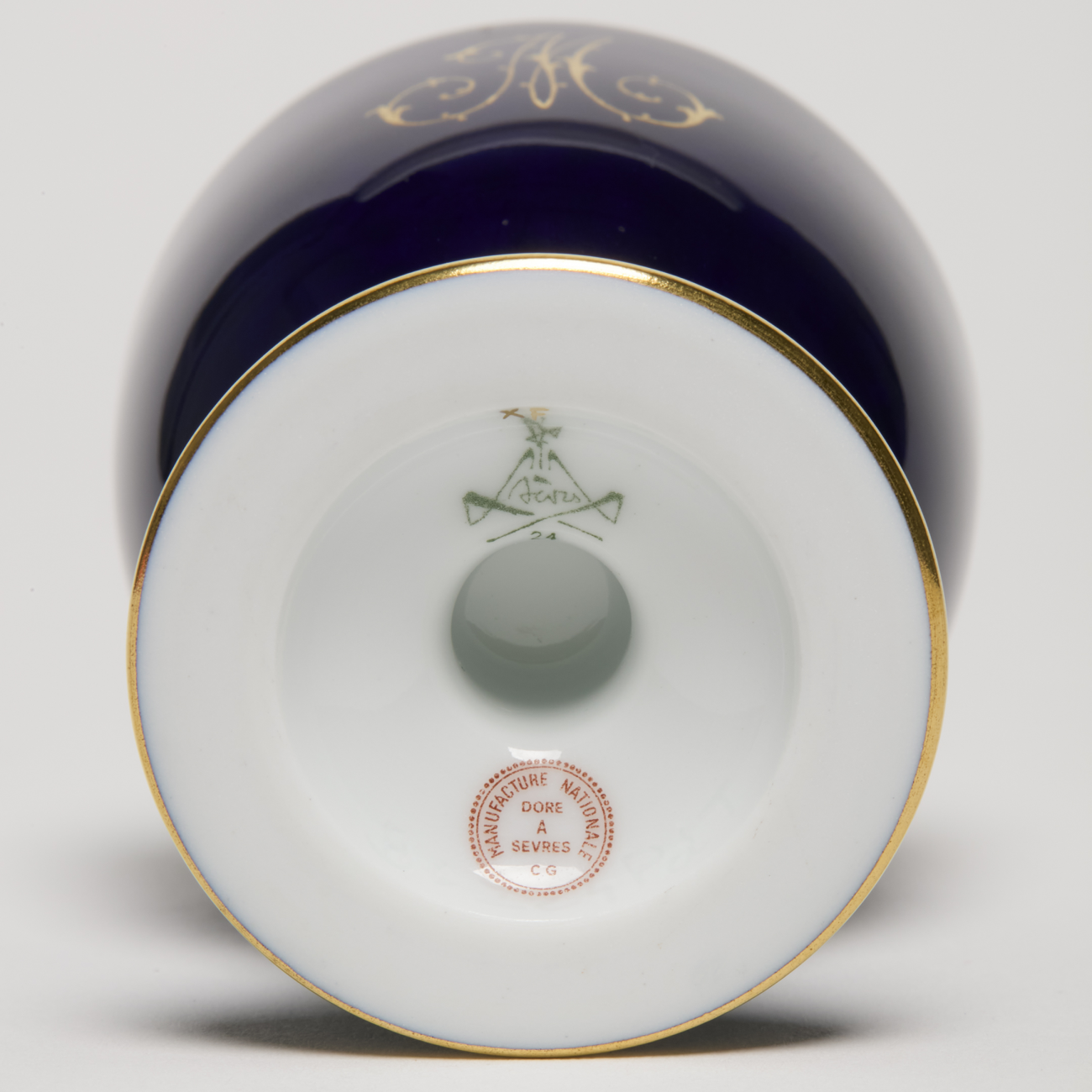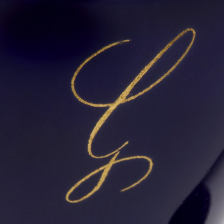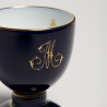 Egg cup from the Daurat service created in 1929 by Maurice Daurat, in turned and enamelled porcelain. Decorated in Sèvres blue with 24-carat gold threads and motifs. Sèvres marks under the foot. Can be personalised to order with one or two initials in gold, in one of the two styles illustrated.