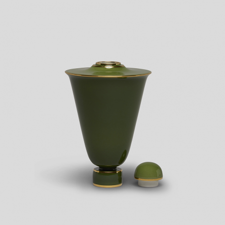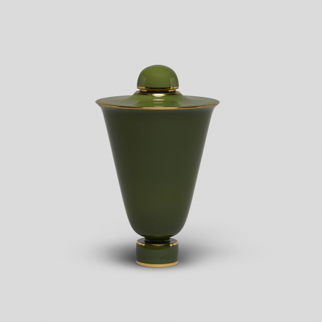 Defying gravity, the singular silhouette of the Rulhmann n°4 vase evokes the very essence of the Art Deco style. Small and closed vase with a cap. Decorated with 24-carat gold fillets. Sèvres marks on the inside of the foot.